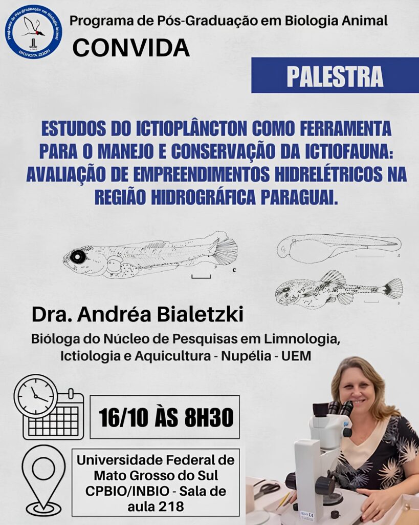 PALESTRA – Prof.ª Dr.ª Andréa Bialetzki (UEM): Estudos do ictioplâncton como ferramenta para o manejo e conservação da ictiofauna: avaliação de empreendimentos hidrelétricos na região hidrográfica Paraguai (16/10/25)